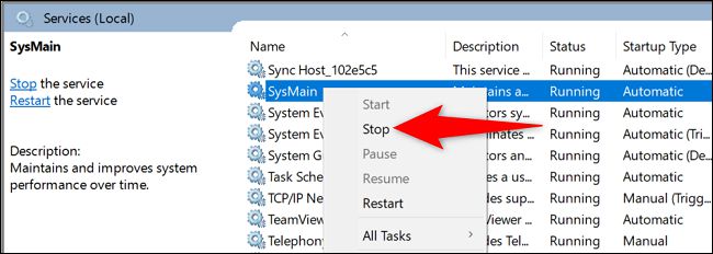在服务窗口右边的窗格中,你会找到题为SysMain的条目,然后右击该条目并选择停止。