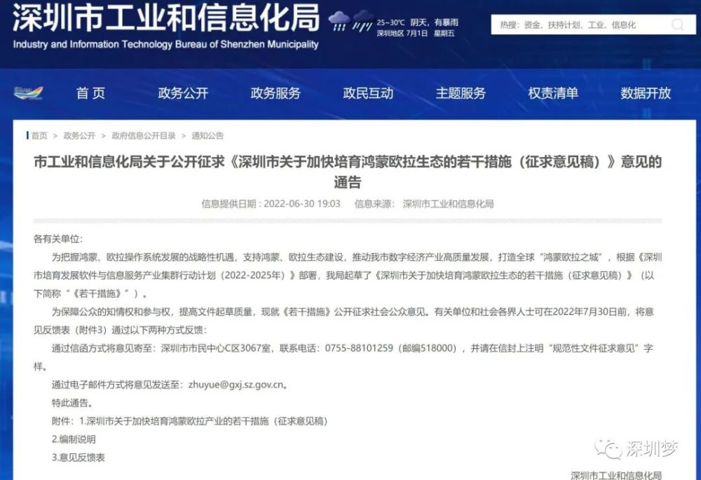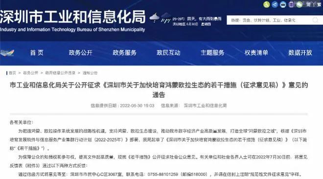6 月 30 日, 深圳工业资料局(简称“深圳工信局”)在官网发布了关于公开征求深圳关于加快红门欧拉生态系统的培育若干措施 (征求意见稿)》(以下简称“《若干措施》”)意见的通告。