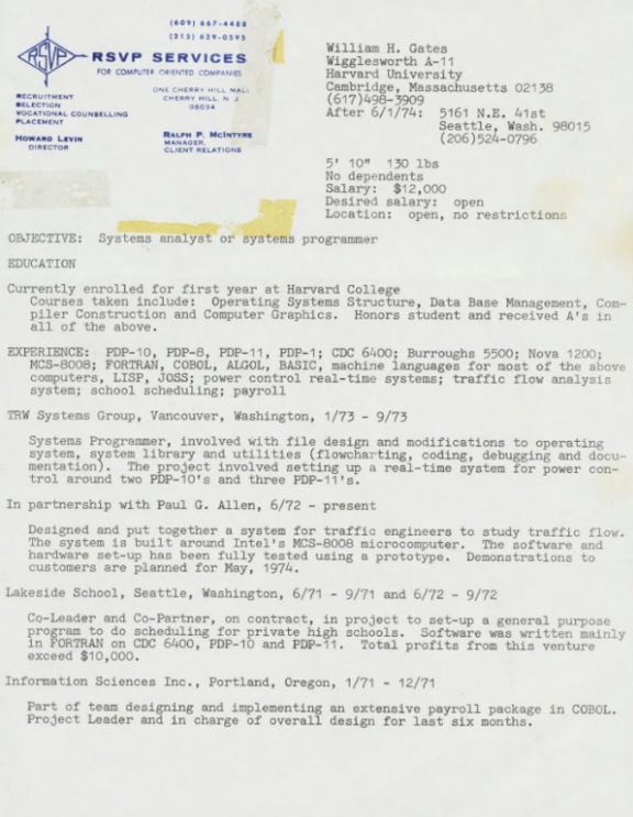 IT之家了解到,盖茨还把一些个人资料添加到他的简历中,他说他身高5英尺10英寸(约1英寸)重量只有130磅(约59公斤)。他只是哈佛大学的新生,但是它列出了每月预期的薪金 $12,00,他还说他希望的薪水会“开放”。