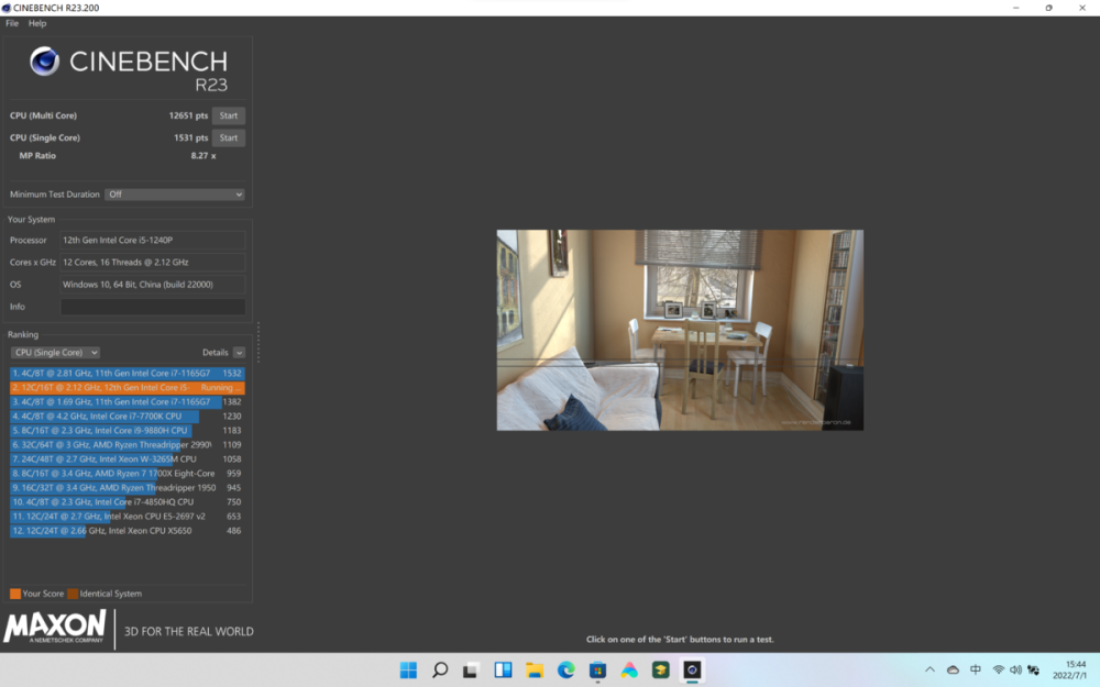 在 Cinebench R23测试中,单一核查分数1531,多核分数12651,在连续10次的多核淘汰赛中,得分稳定在11310分左右,这个分数仍然很好,提供专业工作,如日常使用和一些图形处理。