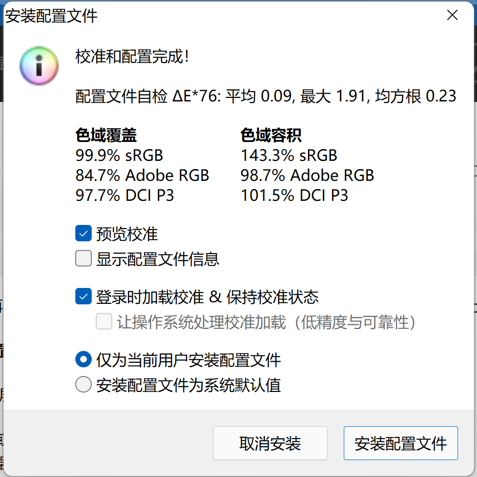 Xiaomi Book Pro 2022的屏幕采用16:10的黄金比例,支持100%的DCI-P3宽带和100%的sRGB颜色,两个颜色可以随意变换,DisplayCAL校正结果也相对令人满意,结果的颜色显示也完全满足了图形处理、建模等专业要求。