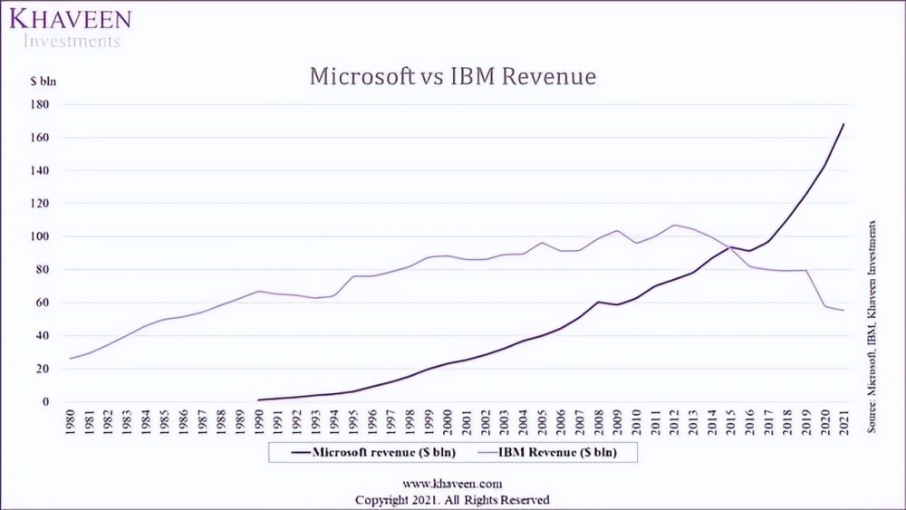 我们计算了1986年微软的非系统软件收入和1980—2021年IBM的非硬件收入的年增长率。因此,我们认为,微软拥有一个多样化的IBM.4%的有利的年增长率,即23%,比IBM的5.8%。