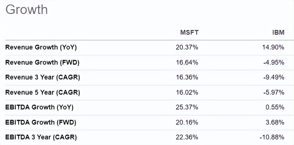 根据我们先前的分析,我们预计微软五年的平均收入增长率将为21.5%,IBM只占5%。此外,该公司的当前和三年平均EBITDA增长率高于IBM。因此,我们认为,所有这些因素都表明微软比IBM增长得更好。