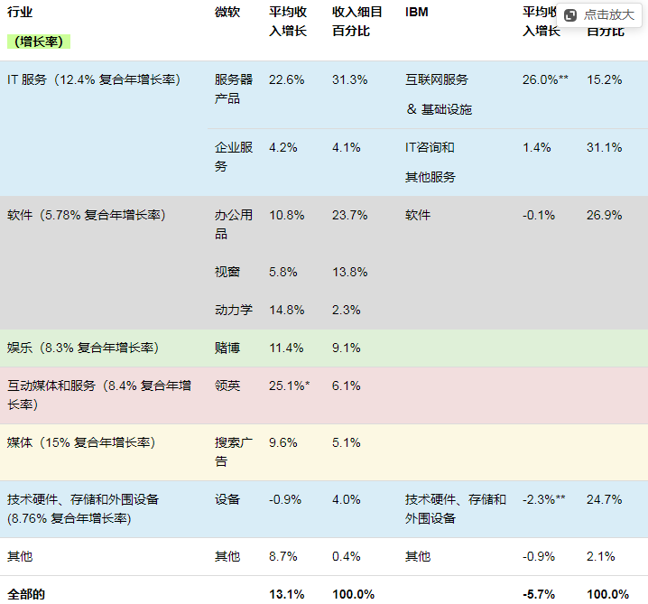 此外,微软的三个部门(服务器产品、LinkedIn和动态)占总收入增长的40%,高于平均(13.1%),IBM只有两个部门(互联网服务及基础设施及资讯科技咨询),总收入的46 % 超过 了 公司 的 总平均 ( - 5.7 % ) 。