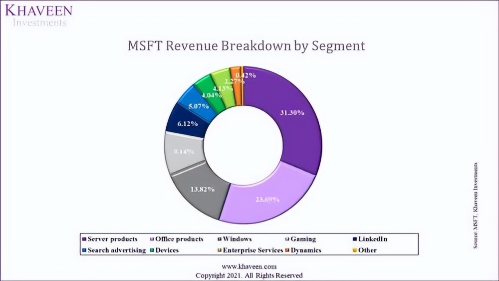 另一方面,微软已从其最大的部门系统软件(1986年收入的53%)转变为应用软件,例如生产力和人力资源软件。2021 年,Windows仅占公司收入的13 %,五年平均增长率低于13.1%,总平均增长率为5.8%。