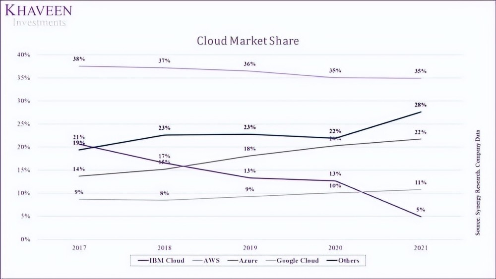 相比之下,IBM的增长率是其竞争对手中最低的,仅为 3.1%。正如我们先前分析中所强调的那样,在IBM于2019年收购了RedHat之后,取消了其公共云业务(Kyndryl)并专注于其混合云业务。话虽如此,根据数据,我们相信,微软已经加强了其在云市场的地位,可以提供它比IBM的优势。