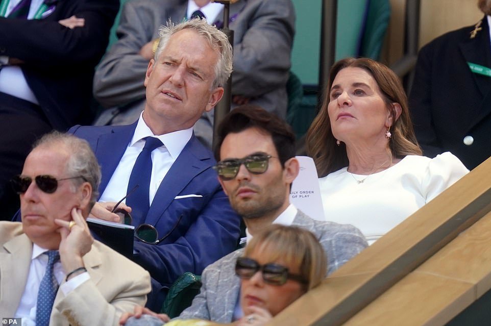 当地时间7月8日,比尔·盖茨的前妻,微软创始人,梅琳达・盖茨,在温布尔登网球公开赛的皇家拳击赛中,在“比尔和梅琳达・盖茨基金会”驻伦敦办事处的高管-乔・塞雷尔(Joe Cerrell)的陪伴下,观看男子单打决赛的比赛。