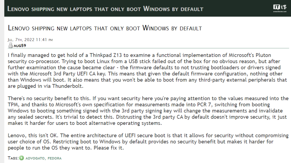 加雷特还提到,ThinkPad Z13不支持从外部设备(如U磁盘)启动Linux。Microsoft Pluton 安全协处理器默认为启动状态,笔记本预先安装了Windows11操作系统。