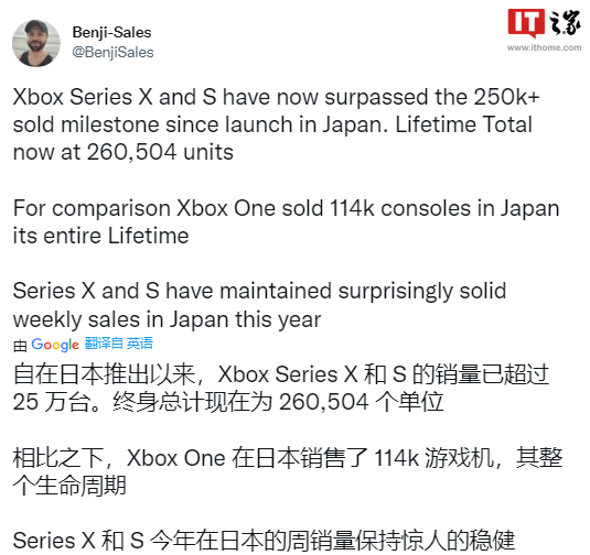 IT之家7 月 9 日消息,今日分析师 Benji-Sales 称,自从微软在日本推出 Xbox Series X / S 以来,其销量已经超过了 25 万台。