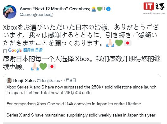 对于微软 Xbox Series X / S 在日本的销售状况,微软Xbox游戏营销总经理亚伦·格林格伯格(Aaron Greengberg)对此表示,“感谢所有在日本选择Xbox的人。我们很感激并且期待你们继续惠顾”。