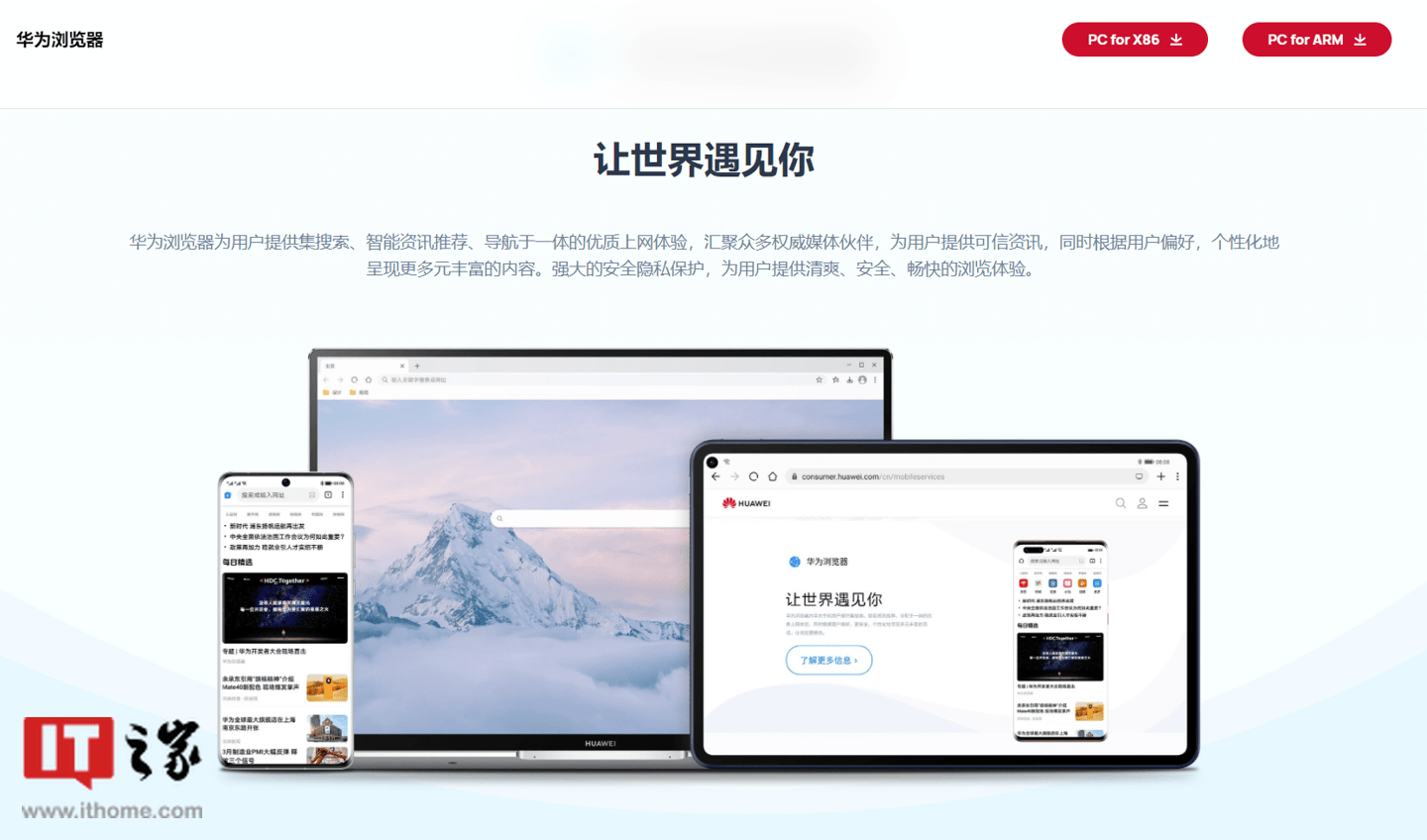 IT之家 7 月 9 日消息,此前华为在手机和 PC 上发布了华为浏览器,支持登录华为帐号,手机、PC 端跨设备同步书签,极简风格,浏览更自如;钓鱼、恶意网址拦截,智能防跟踪浏览更安全。然而,在PC桌面方面,Huawei只推出了X86版本的PC。