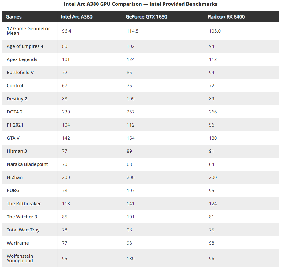 根据Intel的官方数据,A380在17场比赛中4次击败RX 6400,只有1次击败GTX 1650。