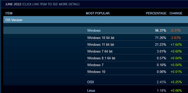 与需要Windows11支持的Intel 12相比,X3D系列在Windows10操作系统上运行得很好,这也是吸引大量玩家的一个因素。基于最近的Steam平台硬件调查统计,尽管Windows11系统用户增长较小,然而,Windows 10仍占71.26%的股份占绝对多数。