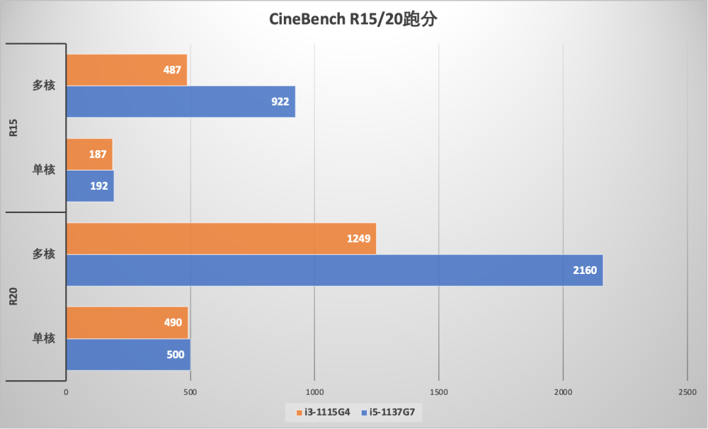 在 CineBench的测试中,R15的单核和多核分数分别为187和487,R20的单核和多核性能分别为490和1249,作为对比,Realme Book的i5-1137G7的R15单核得分是192分,多级分数为922;单级分数为500;分数为2160。