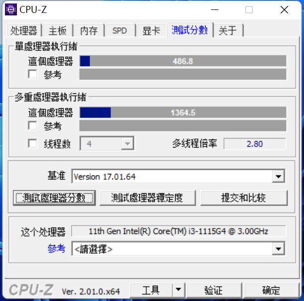 在CPU-Z测试中,处理器的单核分数是486,大约8分钟,多核处理器1364.大约6分钟。作为参考,第一个 realmeBook增强版由Air发行,i5-11320H的单核性能为588.2,分数为2956.9.当然,后者是标压处理器,TDP 45W,28W比i3-115G4高得多,考虑到这个因素。
