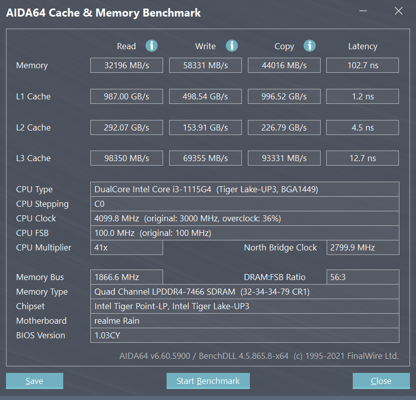 内存部分,这个领域是我的笔记本电脑Air,它装有8GB的LPDDR4X4266 MHz内存,時系列32-34-34-79 CR1。使用AIDA64来测试内存缓存,测量的读写和复制带宽分别为32.96 MB/s、5.8331 MB/s和44016 MB/s。延迟为102.7ns。