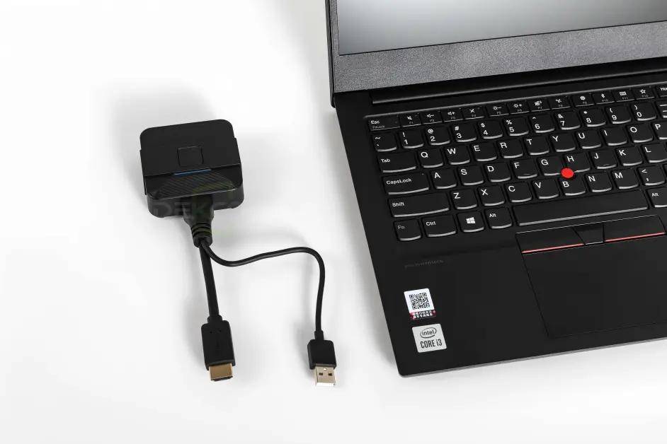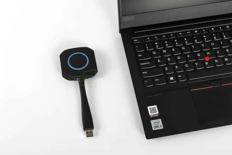 插入笔记本这端的投屏按键,小编给大家展示实物图,需要注意的是,HDMI投屏器在使用的过程中,是需要也把USB线给插上,投屏器才能正常使用,这根USB线是用来供电的,不具备通讯协议。