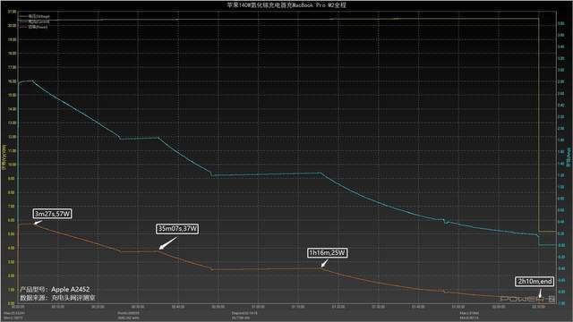 这是使用苹果140W充电器的USB-C接口来充电整个Macbook Pro M2的数据,整个过程大致分为四个阶段,输出电压为24.46V,用57W电源充电MacBook Pro M23分钟27秒,然后功率逐渐下降到37W,并为其充电9分钟,后来电压降到25W,充电器27分钟,在那之后,权力又开始逐渐下降,充电后2小时10分钟,最高功率为57W。
