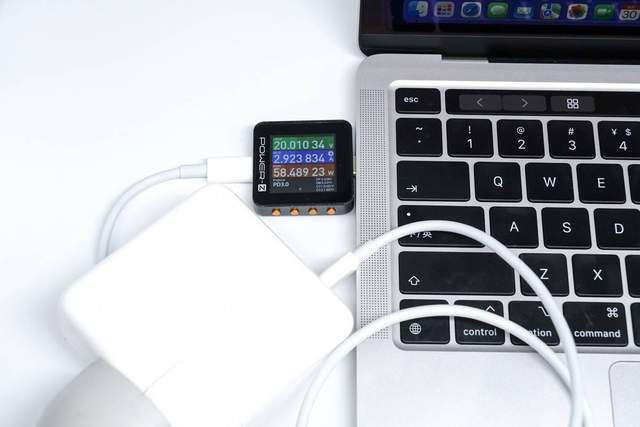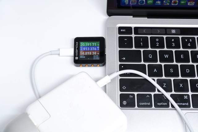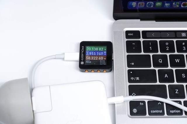 它使用Apple 67W充电器来充电MacBook Pro M2,功率为20.01V 2.92A 58.49W。