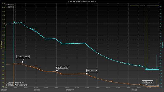 这是使用苹果67W充电器的USB-C接口来充电整个Macbook Pro M2的数据,整个过程大致分为四个阶段,输出电压为20.35V,为Macbook Pro M2充电15分钟56秒,57W功率,然后电力逐渐下降到38W,并充电10分钟,然后电力开始逐渐下降到32W,将设备充电22分钟,然后,电力开始逐渐下降,充电后2小时16分钟,最高功率为57W。