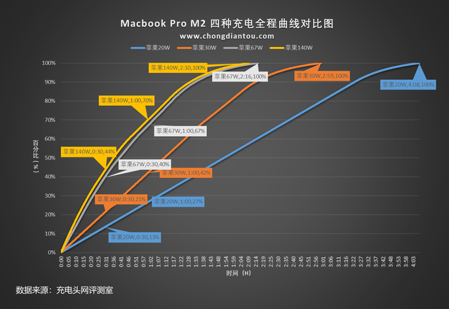 从图中可以清楚地看到苹果67W充电器和苹果140W充电器的趋势,他们可以在半小时内将40%以上的电力泵入MacBook Pro M2.1小时的时候,Macbook Pro M2泵的两个充电器占功率的67%和70%,完成填充需2小时10分钟和2小时16分钟。
