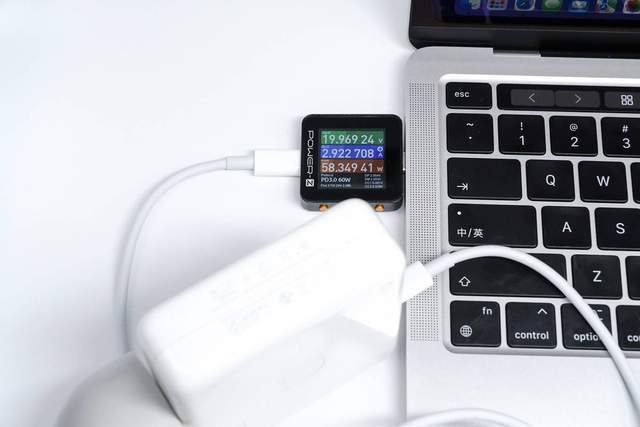 它使用苹果的87W充电器来充电MacBook Pro M2,功率为19.97V 2.92A 58.35W。