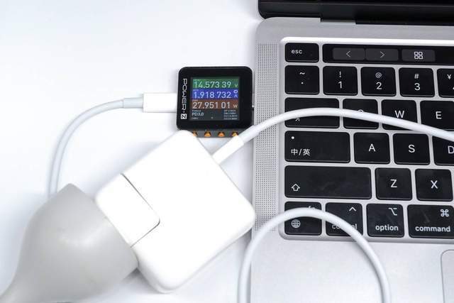 它使用苹果的29W充电器来充电MacBook Pro M2,功率为14.57V 1.92A 27.95W。