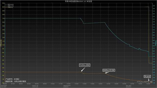 这是使用苹果30W充电器的USB-C接口来充电整个Macbook Pro M2的数据,整个过程大致分为三个阶段,输出电压为19.98V,使用28W的电源,MacBook Pro M2可以充电1小时35分钟,然后为Macbook Pro M2充电27分钟的25.5W电源,然后,电力开始逐渐下降,于3小时充电结束,最高功率为28W。