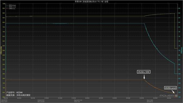 这是使用苹果20W充电器的USB-C接口来充电整个Macbook Pro M2的数据,整个过程大致分为两个阶段,输出电压为8.6V,用18W电源充电Macbook Pro M23小时24分钟,然后,电力开始逐渐下降,充电时间为4小时8分钟,最高功率18W。