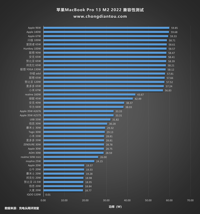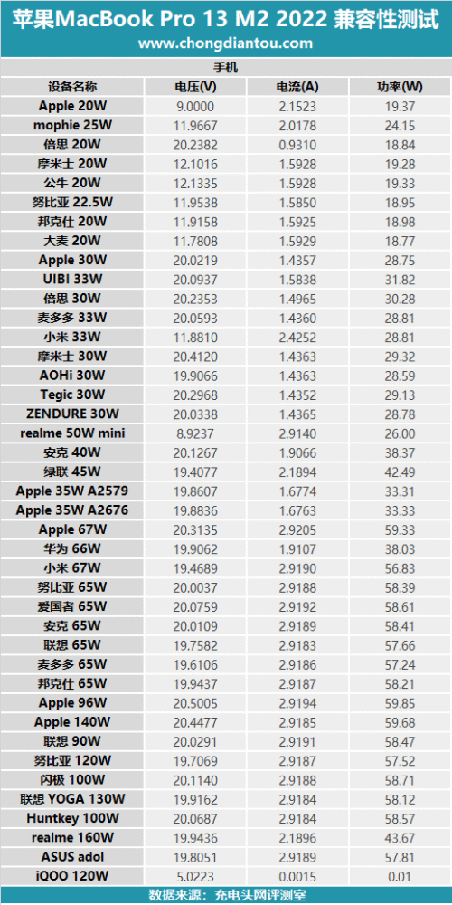 将兼容性测试数据汇总,100W档位充电器和大部分65W档位充电器均可为MacBook Pro 13 M2 2022 提供20V 3.25A 65W的功率进行充电。