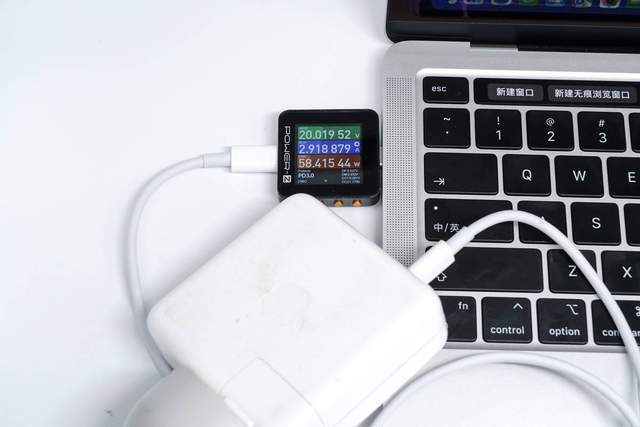 它使用苹果61W充电器来充电MacBook Pro M2,功率为20.02V 2.92A 58.42W。