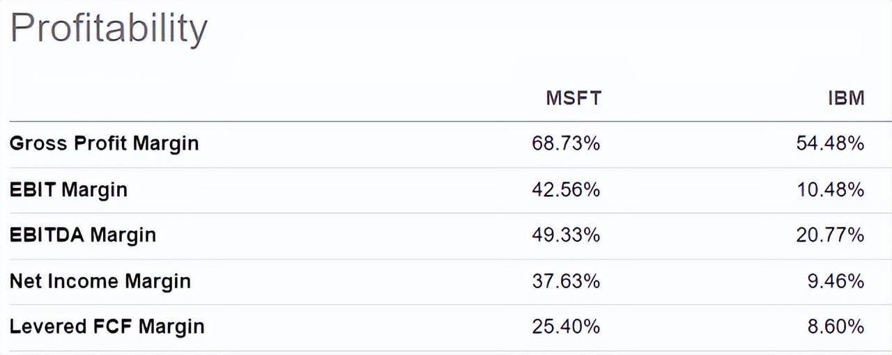 根据该表,尽管收入下降,IBM仍保持盈利性,平均回报率为正;然而,基于当前和五年平均水平,微软的毛利率、运营利润率、EBITDA、净利润率和FCF利润率高于IBM。