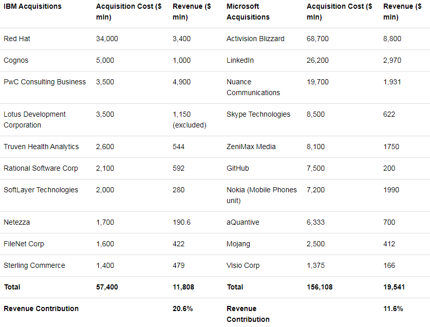 上表显示IBM和Microsoft在收购成本和收入方面排名第十。IBM已经进行了一系列收购,例如中间件软件的 Lotus Development Corp,2018年,它以1.8亿美元出售给HCL。损失为17亿美元。