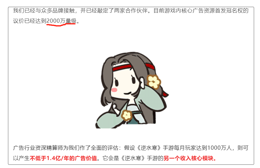 《逆水寒》手游可谓艺高人胆大,他们大胆预测:每年会有1.4亿的广告收入!而且,目前他们已经有2000万的广告进账,这可真是一个美。