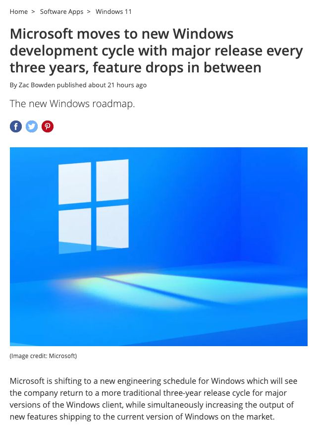 微软现在计划每三年发行一次Windows的主要版本,目前计划在2024年发布下一个版本(外部暂定名称为Windows 12),Windows 11将在2021年3年发布。这意味着最初计划的2023版本的Windows(名为Sun Valley 3)已经被取消。随着这项新的发展计划的推进,微软还计划在最新版本的Windows上添加新功能。
