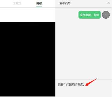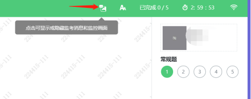 2、如考中考生遇到非技术性问题,可以向监考老师寻求帮助。方法:点击右上角的鹰眼图标,如下图箭头所指处,点击后会出现对话框。