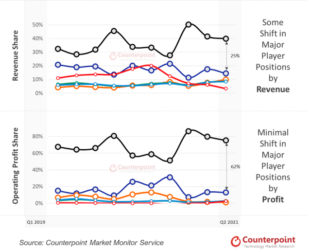 作为智能机器时代的先驱,iPhone也夺走了其中一些最富有的利润。根据Counterpoint统计的数据显示,在全球智能手机市场上,苹果家族夺走了全部利润的75%,主要竞争对手三星只赚了利润的13%。该公司因低价竞标而受到质疑的Huawei夺走了利润的不到5%。