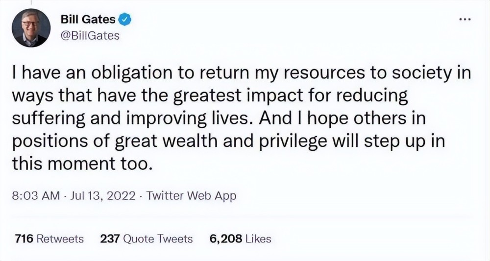 比尔盖茨还表示,我有义务将自己的资源回馈给社会,通过这种方式,我希望可以减少人民的痛苦,同时也能帮助部门穷苦人改善生活。
