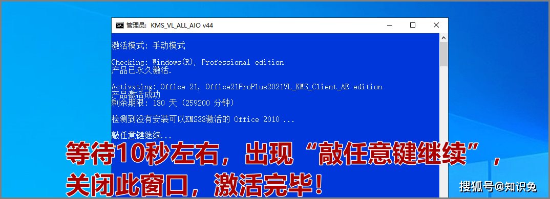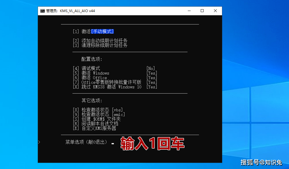 您将打开一个像下面所示的黑色窗口,然后输入下面的1来开始激活。 在输入1之后,蓝色的激活页会自动输入,没有干预,并且等待大约10秒,然后出现“继续按键”, 也就是激活成功时。