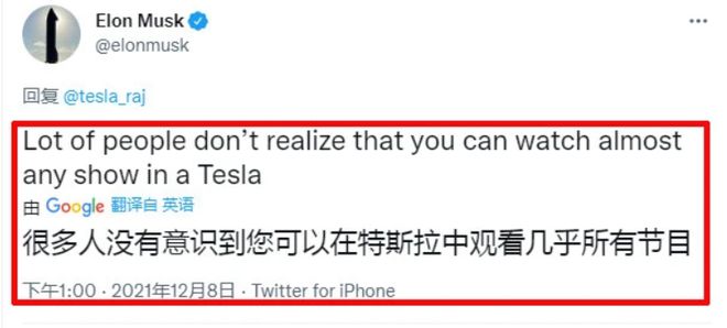 特斯拉的车载系统现在已经搭载了很多娱乐方式,如一些小型游戏和视频网站。早在 2021 年 12 月,马斯克就发过一条推文:“很多人没有意识到,在特斯拉汽车上可以看几乎所有的节目。”