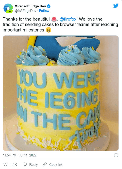 几年后,微软IE团队收到了来自MozillaFirefox团队的欢乐蛋糕