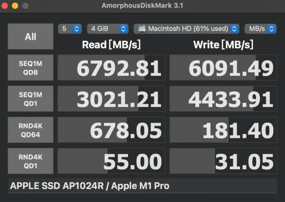 上面的图片显示了M1Pro MBP的磁盘性能,是当前铅笔的最高级别,MacBook Air的正常读写性能应该与MacBook 13一样目前测试中的MBP13的256G版本具有低的磁盘性能,除容量和其他因素外,估计512G或更高版本的磁盘性能应该是大约300M的读写,它比M1Pro好两倍。