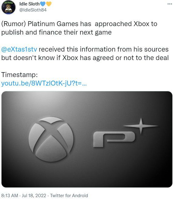 eXtas1stv说,白金工作室已向微软Xbox发送了一份详细的项目介绍,还 要求 提供 财政 支助 。微软必须承诺发行游戏,这将使新游戏成为Xbox独家游戏。目前,白金工作室的下一个新作品没有细节,不排除该协议仍在讨论中,或许也没讨论。