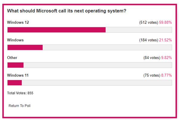 这套下一代系统到底如何称呼,答案显得不言而喻。在WinCentral的统计中,近6成网友力挺“Windows 12”,这也最顺利成章。