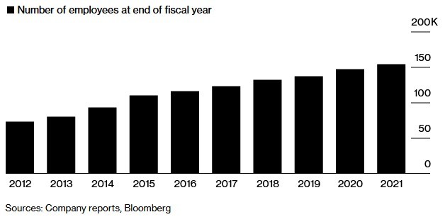 苹果公司的员工在过去十年里稳步增长