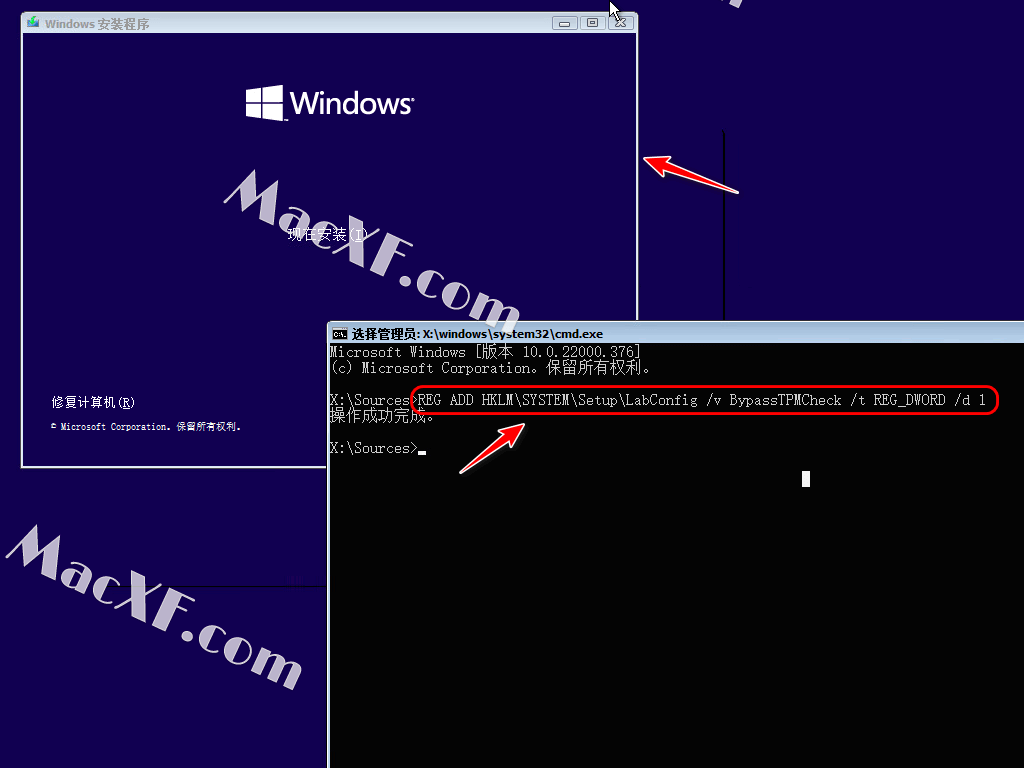 在安装Windows 11时,进入下一个步骤,Shift+F10到命令提示,即“设置现在”。添加注册表键值以绕过TPM检查;如果您正在从微软的官方ISO镜子下载,请在提示中键输入阶段输入命令提示;然后它将正常安装。