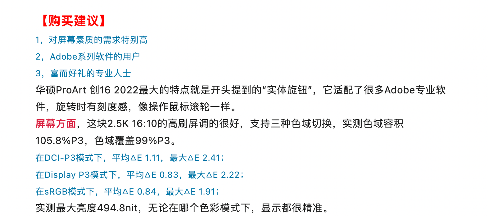 这个屏幕已经通过了Pantone颜色认证和卡尔曼认证专业颜色认证,出厂前逐台校色,有着Delta-E<1.5专业级色准,还有低蓝色光眼保护认证 、 直流调制等.长期创造也能更好地保护眼睛。总而言之, 它是一个大 、 明亮和快速的屏幕.能够满足大多数制作者对色彩显示的需求。