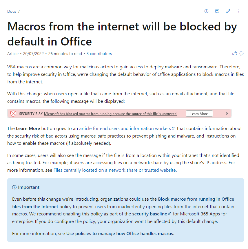 在新的规则生效后,当用户尝试使用互联网上的宏来打开Office文件时,就会看到安全警告通知。该消息将显示一个链接到支持页面上的“更多信息”按钮,该按钮描述了使用VBA宏来打开文件所涉及的风险。 此外,在用户信任的文件的情况下,提供有关启用宏的信息。