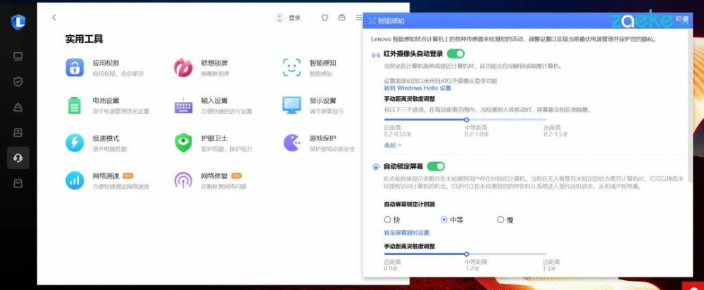虽说“最好的科技,而是你没有感觉到技术的存在。然而,ThinkPad几乎没有关于如何打开和手动引导智能传感器系统的信息。我甚至花了十几分钟搜索,发现系统需要手动打开。此外,多个功能需要独立开放,具体操作需要通过出厂自带的“联想电脑管家”程序,选择“实用工具”,然后在第三个菜单中的“智能感知”功能中打开相应的功能,不排除某些用户直到计算机寿命结束,他们不知道这些功能的存在。
