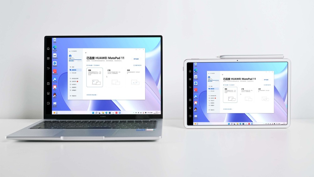 除了与手机和打印机一起工作,Huawei MatePad 11也可以连接到个人电脑,以 Huawei MateBook 14 为例,电脑端安装好【华为电脑管家】,打开应用程序和搜索Huawei MatePad 11,当连接时,可以选择三个模式:镜子、扩展和共享。